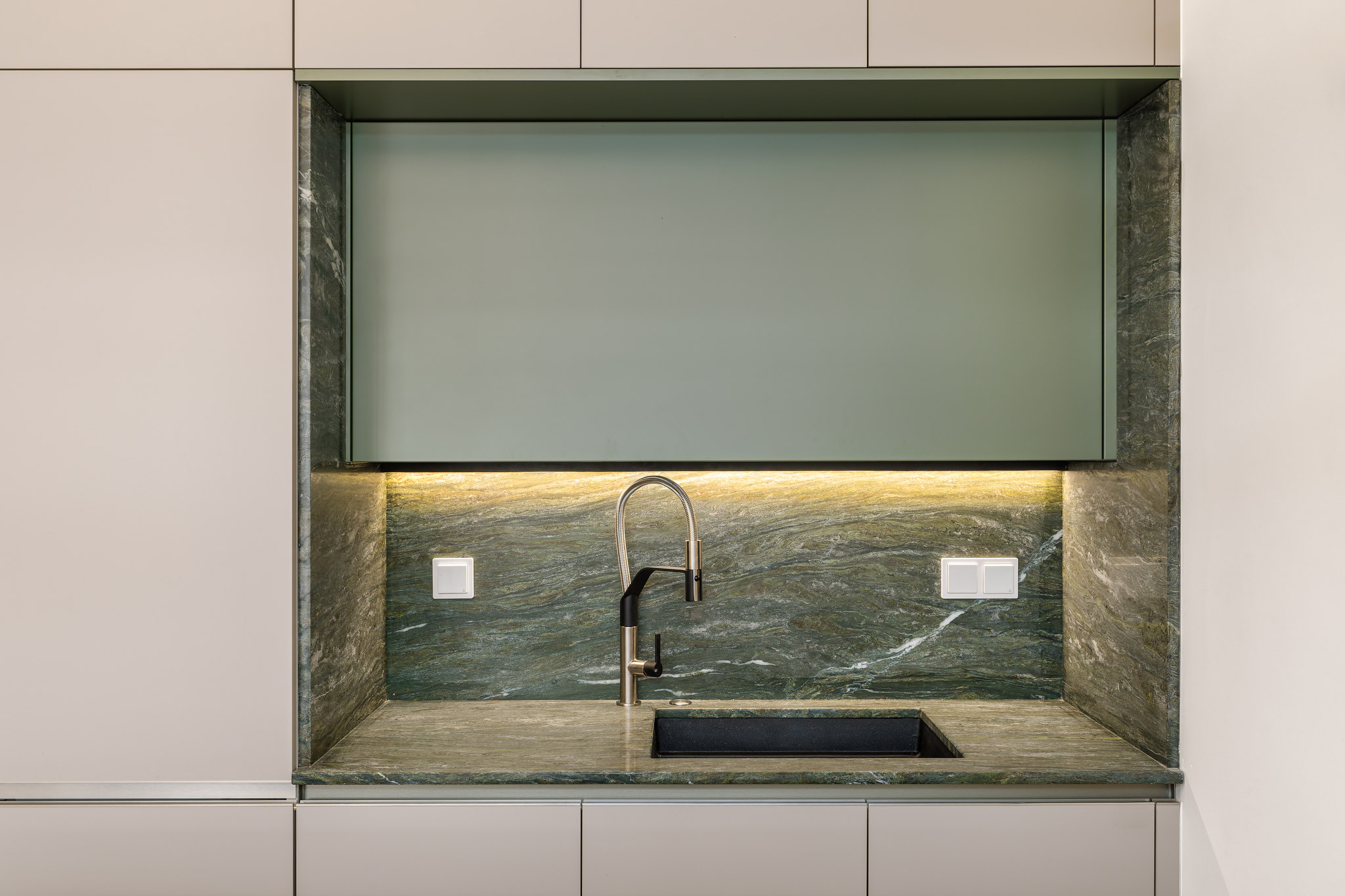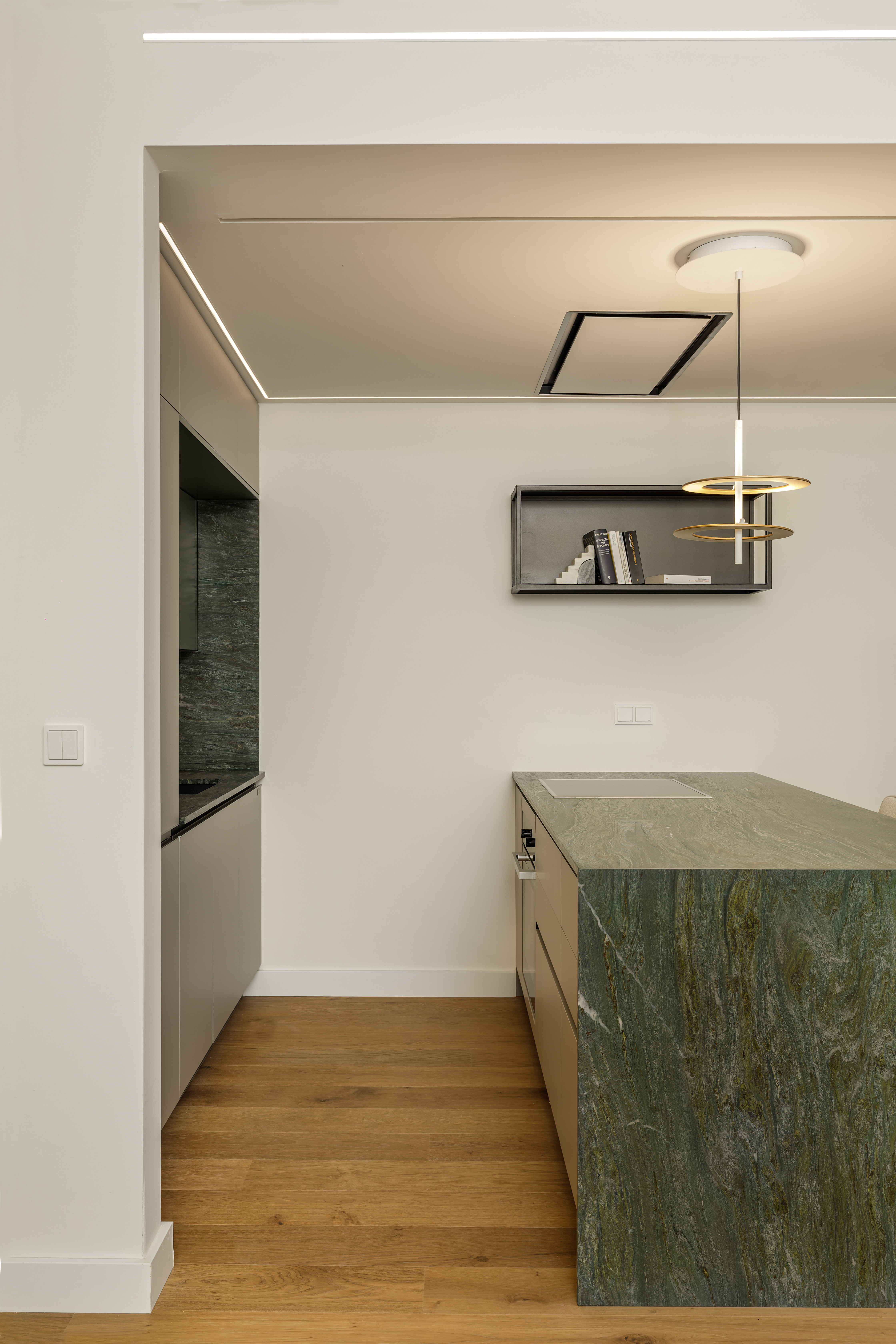 Η κουζίνα σχεδιάστηκε ως προέκταση του καθιστικού και όχι ως ένας τυπικός «οικιακός» χώρος. Με χαρακτήρα περισσότερο bar και λιγότερο παραδοσιακής κουζίνας, ενσωματώνεται πλήρως στη συνολική αισθητική της σαλότραπεζαρίας. Η νησίδα, επενδυμένη με πράσινο μάρμαρο, λειτουργεί ως κεντρικό σημείο κοινωνικής συναναστροφής.